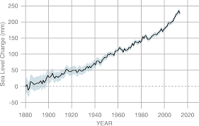 2. The rise in sea levels: As briefly discussed before, an increase in global temperatures will cause more ice to melt, which will thus cause a rise in sea levels. In fact, we are already seeing this rise happen, which is both a consequence and evidence of climate change. This rise in sea levels means that the atmosphere must be warming greater than what is normal, with such increases in sea levels not seen before in the modern world. Look at the graph below by NASA for a visualisation of this rise: